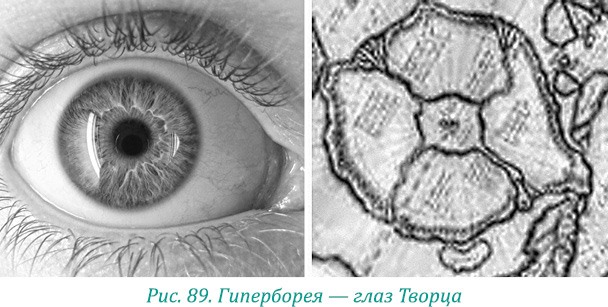 «Глаз» Гипербореи точно повторяет строение человеческого глаза: зрачок, радужка, глазное яблоко. Четыре реки Гипербореи, которые текут с горы Меру, – это четыре сосуда центральной артерии сетчатки, питающие четыре внутренних слоя сетчатой оболочки, а также внутриглазную часть зрительного нерва.