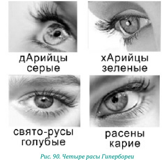 Как свидетельствуют древнеславянские предания, когда-то на великий материк Арктида прибыли не одна раса, а четыре: харийцы с изумрудно-зелеными глазами, святорусы – с голубыми, дарийцы – с серебряно-стальными и расены – с карими глазами.