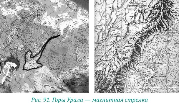 А самые упорные в вере – расены, с огненно-карими глазами, – решили идти по магнитной стрелке Урала до самого конца. Она указала гиперборейцам (предкам ариев) направление исхода (рис. 91).