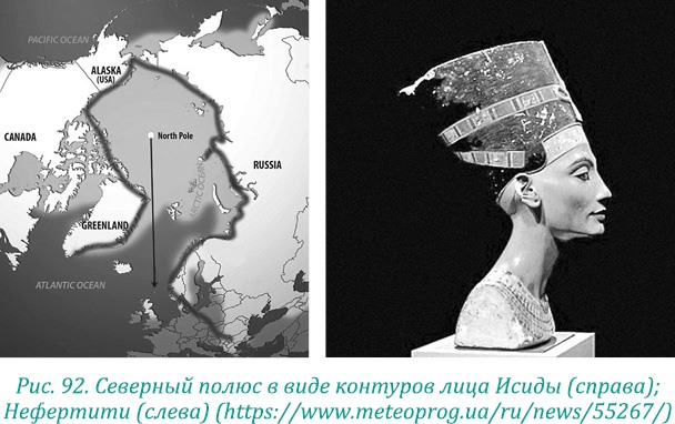 В рельефе берегов Северного полюса мы видим лик Исиды (рис. 92, слева). И он очень похож на лицо Нефертити (рис. 92, справа). Как видите, боги всегда являют нам себя, и только ограниченность нашего зрения мешает нам их увидеть.