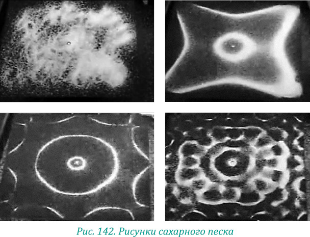 Если посмотреть это видео: http://www.nvtc.ee/e-oppe/Sidorova/helilaine/ultrasound.html, – то можно увидеть, какие удивительные рисунки образует горка обычного сахарного песка при воздействии на нее ультразвуком (рис. 142).