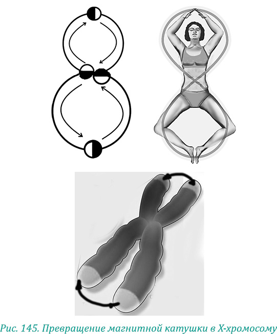 Магнитная катушка сложена из двух слоев: радиальной обмотки и концентрической части, расположенных перпендикулярно друг к другу. Если отделить эти обмотки друг от друга, получатся два разных по величине кольца Мебиуса. А если разрезать эти кольца, мы увидим Х-хромосому (рис. 145), фрагмент спирали ДНК.