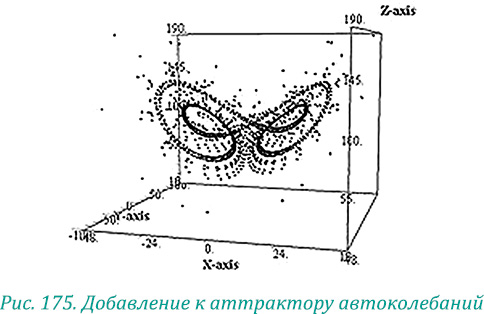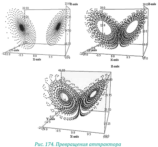 На рисунке 174 показано превращение двух полюсов в обычный аттрактор, а потом и в аттрактор Лоренца, который при добавлении режима автоколебаний превращается в подобие системы инь-ян (см. рис. 175).