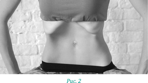 Подтяните грудобрюшную диафрагму под ребра (вглубь и вверх под солнечное сплетение). Вы должны ощутить некий «чмок» вакуумного засасывания (рис. 2). Втянутый живот должен «прилипать» к позвоночнику, причем не чуть-чуть, а засасываясь буквально «под ложечку». Вот это и есть максимальное подтягивание диафрагмы при выдохе.