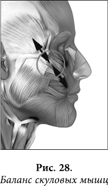 Как видите, волокна скуловых и височных мышц находятся на одной диагонали, баланс натяжения которой держится на скуловой кости. Поэтому стягивание одной половины диагонали будет вести к растяжению другой. По «мнению» организма, баланс таким образом будет соблюден.