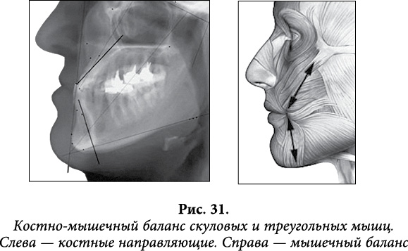 И тогда нарушится второй баланс – между скуловой мышцей и треугольной: если скуловые мышцы растягиваются, треугольные тут же стягиваются. Этот баланс можно показать в виде ромбиков: скуловая и треугольная мышцы образуют один треугольник этого ромбика, а вторая вершина ромбика упирается в челюстной угол, поскольку эта геометрия увязывается с тонусом жевательных мышц, притягивающих нижнюю челюсть к верхней.