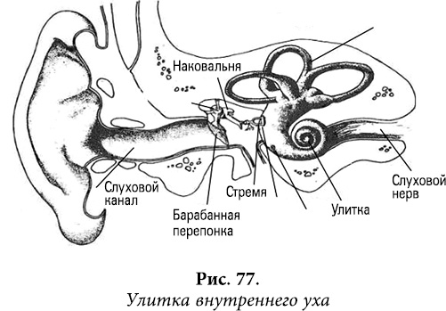 И первой его принимает воронка внутреннего слуха, так называемая улитка – орган, воспринимающий звуковые колебания и превращающий их в нервное возбуждение, он имеет спиральную природу из 2,5 витков. Ее мембрана состоит из 24 тыс. особых волокон (слуховых струн) (http://bono-esse.ru/blizzard/A/Posobie/AFG/OCH/auris.html).