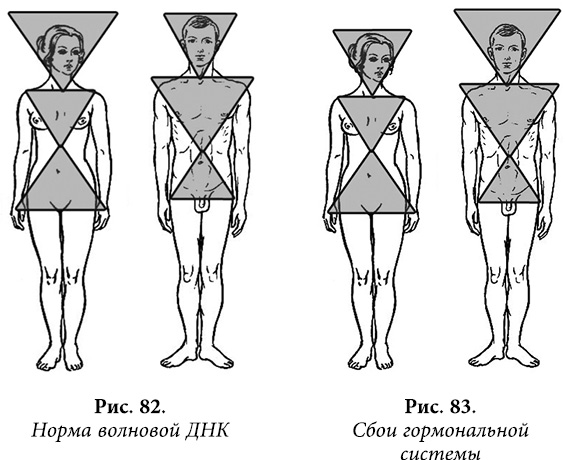 Но в случае нестыковки волновой и материальной природы ДНК происходит гормональный сбой: наполнение «амфор» тела будет осуществляться в противоположных местах. К примеру, как только у женщины генетически или в связи со спортивными тренировками начинает вырабатываться излишний тестостерон, у нее сразу увеличивается верхний треугольник в ущерб нижнему: кость и мышцы растут, в то время как вторичные половые признаки в виде груди чаще всего уменьшаются.