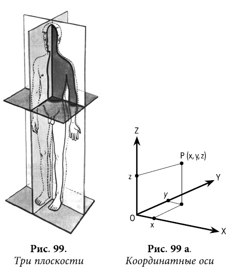 Если показать это на фигуре человека в трехмерном измерении (Х-Y-Z) (рис. 99), то две плоскости, перпендикулярные друг другу, будут фронтальной и сагиттальной.