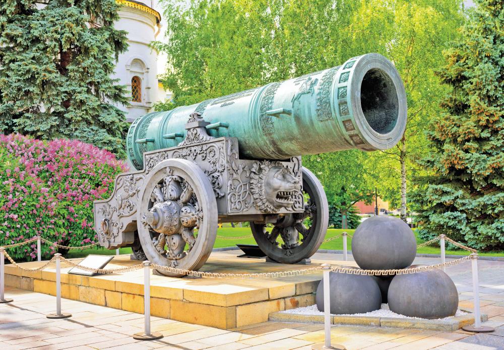 Царь-пушка получила свое название не случайно. Это крупнейшая в истории бомбарда с калибром отверстия в 890 мм, а длина ее ствола составляет 5,34 метра. О ней даже написано в «Книге рекордов Гиннесса». Орудие было отлито из бронзы в 1586 году во время царствования Бориса Годунова мастером Андреем Чоховым на Пушечном дворе в первопрестольной. Весит эта махина почти 40 тонн. Изначально ее хотели использовать по прямому назначению – для обороны города, – но получилось так, что Царь-пушка ни разу не принимала участие в сражениях.