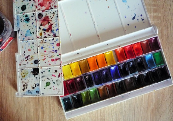 О красках. Сейчас появилось много новых сортов и форм выпуска акварельных красок, они бывают в кюветах – картонных или пластиковых, это сухая акварель; в тубах и баночках – жидкая. Краски бывают учебные и профессиональные, обычно советуют начинать с профессиональных художественных красок, именно они дают почувствовать всю прелесть и многообразие свойств акварели. Но при этом такие краски довольно дороги, поэтому выбирайте лучшие из той ценовой категории, которую можете себе позволить.
