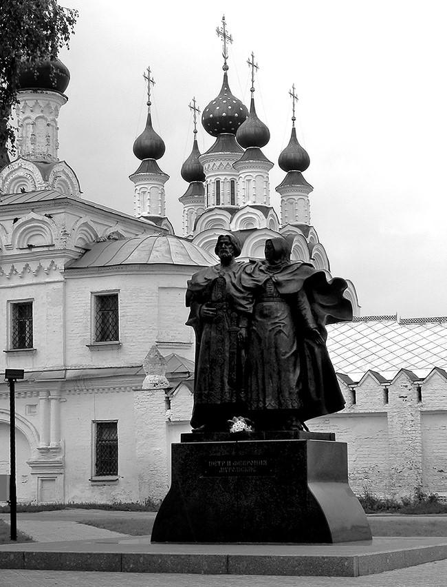 Другие известнейшие муромские святые – Петр и Феврония – почитаются сейчас как хранители семьи и брака. Между тем, об их земной жизни почти ничего не известно. Вернее – все, что мы о них знаем, почерпнуто из «Повести о Петре и Февронии», написанной в XVI веке неким священником Ермолаем по заказу митрополита московского Макария. Ермолай же создавал свою «Повесть» на основе устных преданий, коих в Муроме было предостаточно. Так что это произведение, в первую очередь, все же литературное и поэтичное – рассказывающее об истинной любви, способной преодолеть болезнь, социальные различия и вообще любые невзгоды. Так, мы узнаем, что Петр, брат муромского князя, сразился со змеем, убил его – но от крови чудища покрылся страшными язвами. Все лекари княжества оказались бессильны, но однажды Петру приснилось, что спасти его может только дочь бортника-пчеловода Феврония. Петр разыскал девушку, но та согласилась вылечить княжеского брата лишь при условии, что тот женится на ней. Петр пообещал, но едва исцелившись, нарушил свое слово (сыграл классический предрассудок – разница в происхождении). Болезнь вернулась и Петр, поняв намек, все-таки сыграл свадьбу.