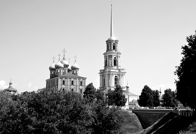 Итак, Рязанский кремль. Сухими официальными словами – один из лучших архитектурных ансамблей России, заповедник федерального значения, музеефицированный еще в 1918 году. А для человека, впервые попавшего в Рязань – невероятное, фантастическое зрелище. Остров чистой красоты и гармонии среди суеты большого города. Сказочно хорош вид кремля с крутого склона в Соборном парке, от церкви Спаса на Яру и памятника Сергею Есенину – уроженцу рязанской земли. Пронзает небо грандиозным шпилем могучая колокольня: со своими 83 метрами она входит в двадцатку самых высоких колоколен России, на целую сажень превзойдя московского Ивана Великого. Красавицу возводили полвека (1789–1840) усилиями целых четырех архитекторов последовательно. Так «само получилось», что каждый из зодчих возвел по ярусу, снизу вверх: Воротилов – Руска – Тон – Воронихин. Целая история в одном архитектурном памятнике.