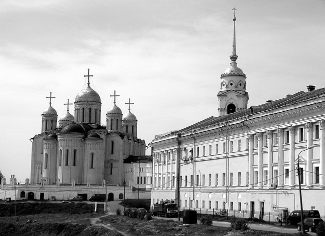Отсюда город виден целиком. И даже больше, чем хотелось бы – с высоты слишком очевидны утраты и такие с точки зрения эстетики сомнительные приобретения, как заслоняющие горизонт промышленные громады ХХ века вперемежку с безвкусными «творениями» нынешних бизнес-архитекторов. Приходится мысленно отшелушивать лишнее, проводить черту в том месте, где за древностью встает современность, словно не к месту поставленная театральная декорация. Старое с новым всегда трудно гармонизировать, но у Владимира вообще вышел глубокий рассинхрон – словно перед нами три разных города. Снаружи – образцовый облцентр «советского» типа, красивый современный город с широкими проспектами и большим количеством зелени. Внутри, в ядре – маленький, со сложным рельефом и запутанной системой улочек губернский городок. Но и у ядра есть свое ядрышко – XIX век безо всякого предупреждения вдруг переходит в XII-тый… Диффузии эпох во Владимире каким-то образом не произошло, и географически слитные, внутри они существуют раздельно, каждая как вещь в себе.