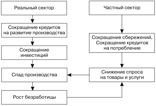 Рестрикционная политика ограничивает возможности получения кредитов на развитие производства, что приводит к сокращению инвестиций, спаду производства и росту безработицы. В частном секторе наблюдаются такие процессы, как сокращение сбережений населения и привлекаемых на потребление кредитов. В результате снижается спрос на товары и услуги, что также тормозит развитие производства.
