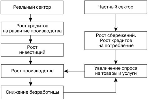 При проведении экспансионистской политики растут кредиты на развитие производства, увеличиваются инвестиции и объем производства, следовательно, количество рабочих мест. Одновременно растут сбережения населения и кредиты на потребление, что ведет к увеличению спроса на товары и услуги, стимулирующему рост производства.