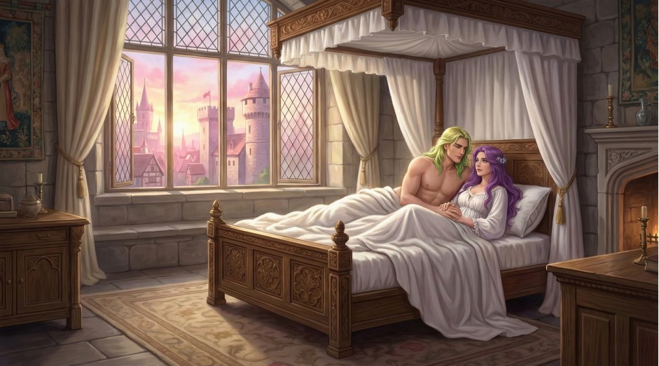 Да, кровать. Это был не просто предмет мебели, а целое сооружение. Широкая, с высоким резным изголовьем из тёмного дерева. Её закрывали тяжёлые занавеси из струящегося бархата, которые сейчас были подхвачены шёлковыми шнурами. На атласном покрывале лежала груда подушек.