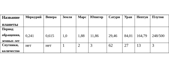 Таблица 1. Планеты Солнечной системы, периоды их обращения и спутники