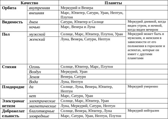 Астрологи делят планеты на благоприятные и зловредные для человека, положительно или отрицательно влияющие на работоспособность, а также соотносят планеты с четырьмя стихиями (огонь, воздух, земля, вода). Кроме того, они разделяют планеты по половой принадлежности, считая, что функции мужских планет ориентированы на внешнее, активное проявление, а женских – на поглощение энергии извне, на пассивность и уступчивость.