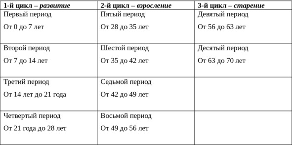 Еще одно популярное деление жизни человека – на семеричные периоды. Пожалуй, первым его предложил Гиппократ. Он выделил 10 периодов, сгруппировав их в три цикла. В настоящее время, учитывая увеличившуюся в среднем продолжительность жизни на Земле, можно было бы добавить еще 3—4 периода.