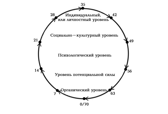 На рисунке 2 схематично изображен цикл семидесятилетней жизни. В таблице 5 представлены 12 фаз по 7 лет с описанием соответствующих им различных уровней жизни человека.