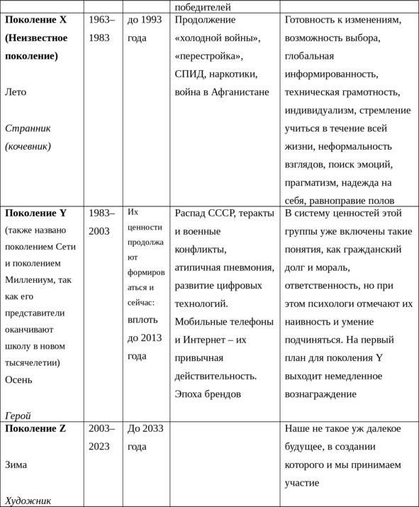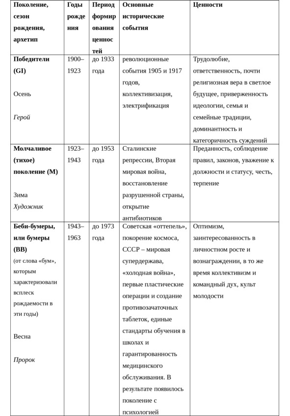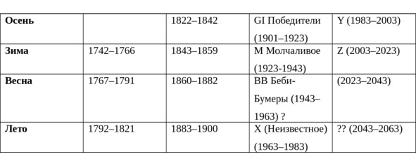 Таблица 7. «Времена года» поколений