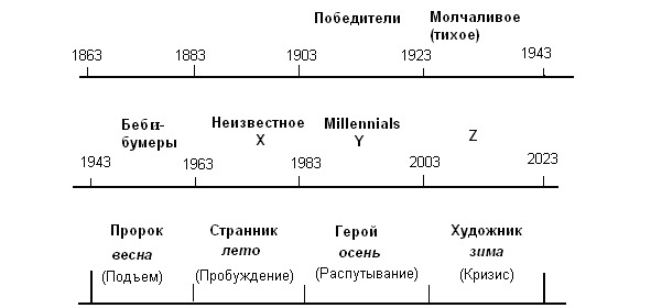 К такому же выводу, видимо пришли и создатели «теории поколений». Она была создана в 1991 году американскими учеными Нейлом Хоувом и Вильямом Штраусом. Причем возникла она на стыке нескольких наук: Нейл Хоув был экономистом и специалистом в области демографии, а Вильям Штраус – историком, писателем и драматургом. Авторы теории проанализировали всю историю США и выявили интересную закономерность. Они обнаружили, что примерно каждые 80 лет рождаются поколения, ценности которых похожи. Хоув и Штраус называют эти поколения по временам года, проводя аналогии с основными тенденциями каждого из них: Весна, Лето, Осень, Зима. Авторы связывают сезоны с ситуацией в окружающем мире: Зима – кризис, Весна – расцвет, Лето – стабильность, Осень – увядание4040