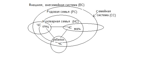 Родовая семья включает в себя нуклеарную и является семейной системой для данных родителей и их детей. Контакты с внешней системой осуществляют как родовая семья (РС), так и нуклеарная (НС) через ее членов. Родовая семья – это составная часть внешней системы (ВС). Каждый член семьи контактирует с внешней системой лично и через границы нуклеарной и родовой систем. Люди по-разному (по форме, объему, качеству и др.) в каждый период своей жизни включены в нуклеарную, родовую и внесемейную системы. Маленькие дети практически полностью существуют в границах нуклеарной семьи. По мере взросления они расширяют контакты в своей родовой семье в той мере, в которой им это предоставляют родители, а позже и другие родственники. Постепенно происходит наращивание ими и внесемейных контактов, они становятся активными членами внешней системы. Их активность во внешней системе побуждает все больше брать из нее новое и вносить в свою семейную систему (СС), которая состоит из нуклеарной и родовой подсистем.