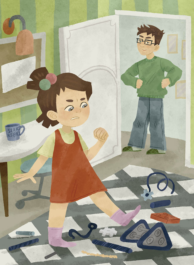 Гоша собирал конструктор прямо посреди гостиной и запрещал прикасаться к деталям, потому что они были разложены в определённом порядке. Но, конечно, все постоянно всё сдвигали. Бейби ужасно хотелось потрогать какую-нибудь детальку, и она то и дело что-то хватала. Собака Соня старалась аккуратно обходить Гошину стройку, но всё равно случайно задевала, а Мира в сердцах вообще пнула разложенные детали, и разразился скандал. Мама была на пределе, и папа тоже.
