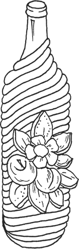 Скатайте из неокрашенного теста длинные колбаски примерно одинаковой толщины и облепите ими нижнюю часть бутылки (до горлышка), на равном расстоянии друг от друга так, чтобы они находились под одним углом. Накладывая, слегка сплющивайте их. Потом наложите сверху еще столько же колбасок, на таком же расстоянии, под тем же углом, но направленных в противоположную сторону. Получится узор из ромбиков. Не забывайте смачивать в необходимых местах полосу нижнего ряда, чтобы закрепить верхние. Ровно обрежьте верхние концы колбасок, чтобы они были на одном уровне.