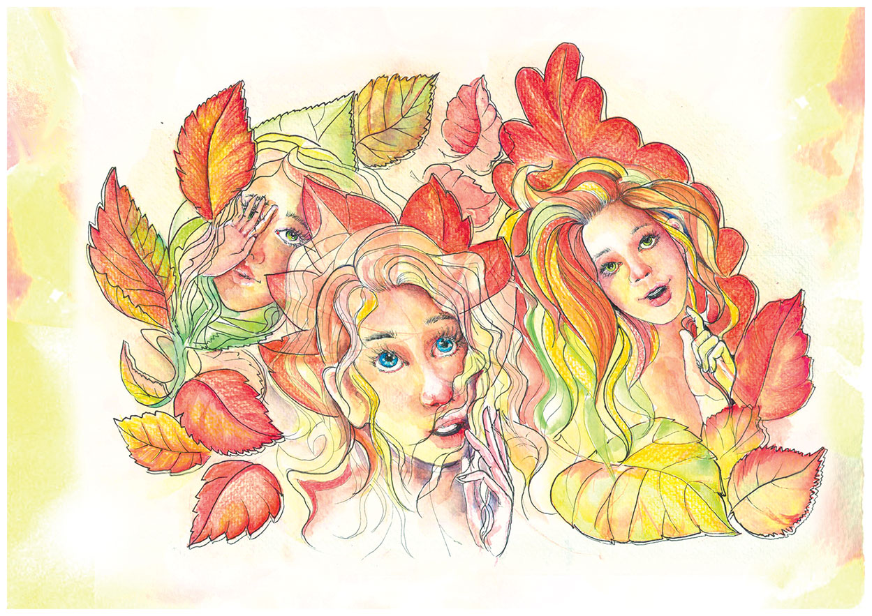 Тем временем наступила осень, и все чаще хмурилось небо. Цветок с удивлением рассматривал перемены в природе, он видел, как зеленые листочки деревьев начали желтеть и краснеть, это было очень красиво. Яркие осенние наряды леса ему нравились, но было в этих изменениях и что-то очень тревожное. Вот и сегодня дул уже совсем холодный осенний ветер, капал дождь, и наш бедный стеклянный цветочек смотрел на небо своими прекрасными и грустными стеклянными глазками. Неожиданно сильный порыв ветра почти засыпал его осенними листьями. Они закружились вокруг цветка, и он услышал их голоса! Они смеялись, чему-то радовались и были очень довольны!