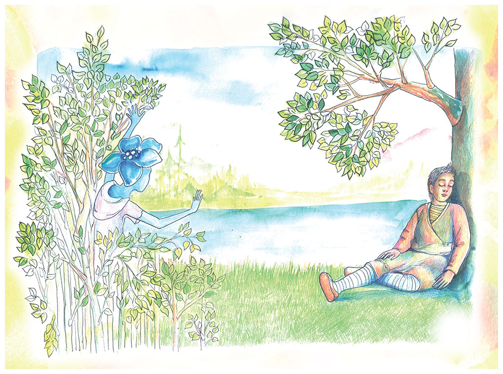Проснувшись, он вновь отправился в путь. И вдруг на лесной опушке под деревом цветок увидел спящего человека. Тихонько приблизившись к нему, цветок внимательно вгляделся в его лицо. Человек был удивительно хорош собой. Наш стеклянный друг приложил свой листочек к его сердцу и испуганно отдернул его.