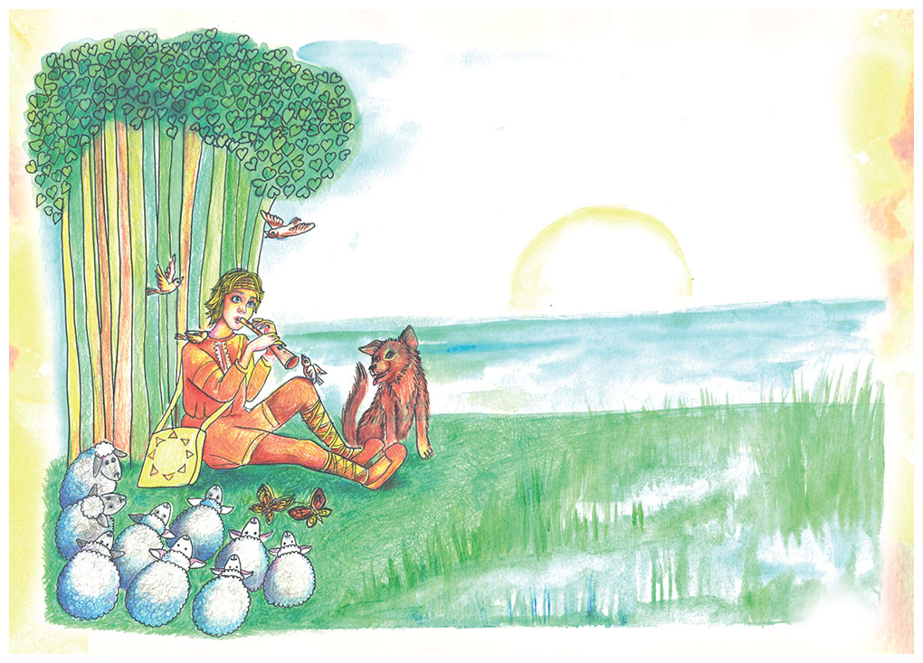 В это время цветок вдруг услышал невероятно красивую мелодию. Играла свирель. Было в этой музыке что-то удивительно теплое, светлое, радостное, и наш измученный поисками цветочек всем своим существом почувствовал, что то, что он искал так долго, совсем рядом! Он поспешил навстречу музыке и увидел сидящего у дерева пастушка. Это он играл на свирели. Пастушок выглядел счастливым и радостным, в его музыке была невероятная любовь ко всему, что его окружало! К лесу, поющим птицам, к небу и утреннему солнышку! Все это было в его чудесной музыке!