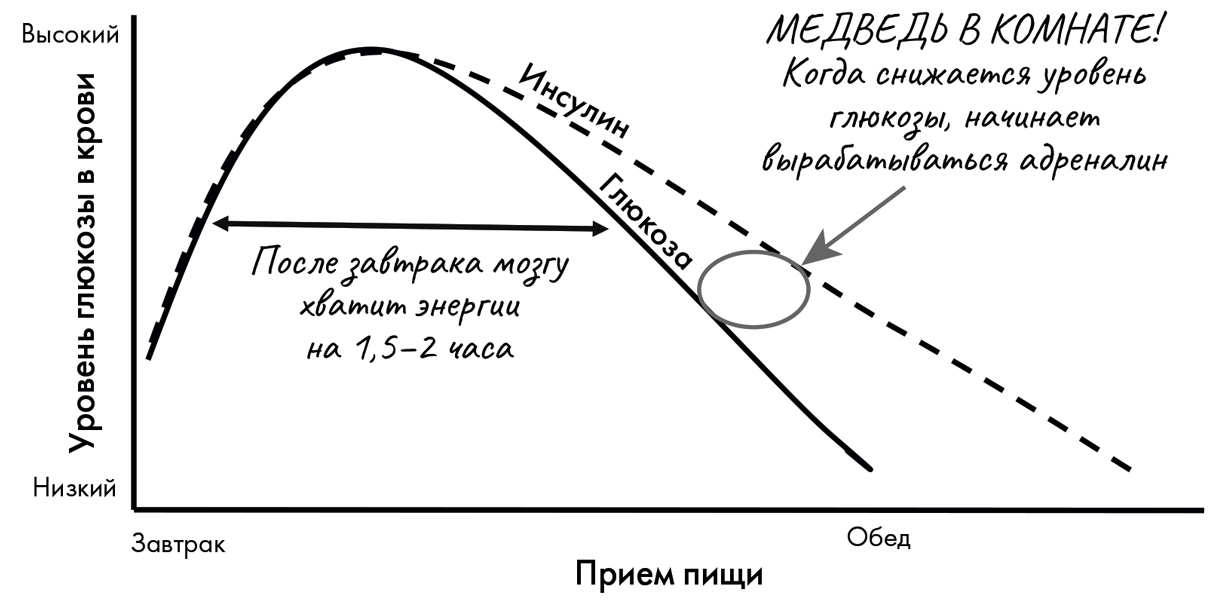 Примерно через 1,5–2 часа после преимущественно углеводного завтрака (хлопья, маффин, пирожок или тост) организм, подгоняемый инсулином, усваивает почти всю глюкозу, поступившую в кровь. Это приводит к резкому снижению уровня глюкозы.