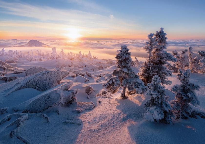 Зимой это сказочная страна, покрытая белоснежным покровом. Здесь хозяйничает вечная мерзлота, величественное северное сияние окрашивает небо в самые невероятные цвета, создавая впечатляющие световые спектакли. Между ледяными сопками свистит пронизывающий ветер, а мороз испытывает на прочность, рисуя снегом на ресницах особо стойких путешественников.