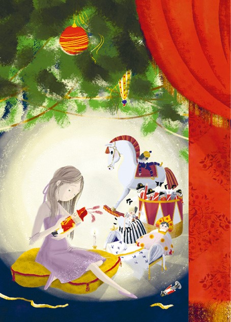 Как зачарованная Клара рассматривала блестящих клоунов и белочек с орехами, зайчиков-барабанщиков и игрушечных лошадок. Все они висели на ёлке, но теперь выглядели совсем как настоящие. Казалось, будто и нарядный солдатик не двигается лишь потому, что стоит на карауле, выполняя важный приказ…