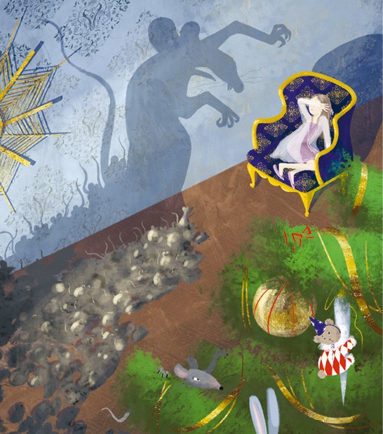 Вдруг ночное безмолвие прорезал механический скрип, и бой часов наполнил комнату. Клара невольно вздрогнула и обернулась. Сова! Она теперь как две капли воды была похожа на Дроссельмейера. Крыльями-руками она взмахивала вверх и вниз, и с каждым ударом часов тени сгущались, становясь всё более мрачными. Сердце у Клары сжалось в комочек. И тут – сначала в одном углу, затем в другом, третьем – послышалось зловещее шуршание. Тёмные тени вздрогнули и зашевелились. Клара вспомнила, как Фриц сегодня говорил про мышей, и холодок пробежал у неё по спине. Ни жива ни мертва от страха, она прямо с ногами запрыгнула в большое кресло.