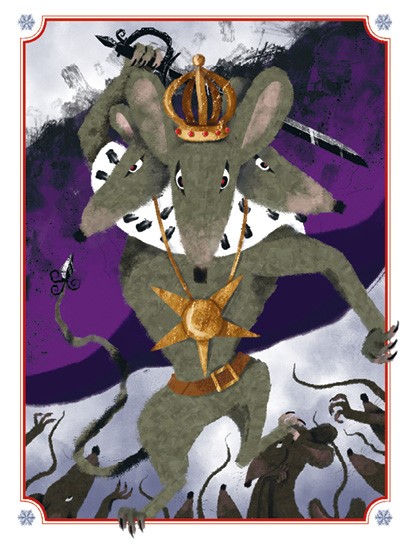 Глаза у Клары засветились надеждой: войско Щелкунчика заметно потеснило мышей, и те с писком и шипением стали отступать. Но тут откуда ни возьмись в полу образовалась большая щель. Из неё, в клубах едкого дыма, показалось мерзкое существо, похожее на большую трёхголовую крысу. На средней голове у чудища блестела корона.