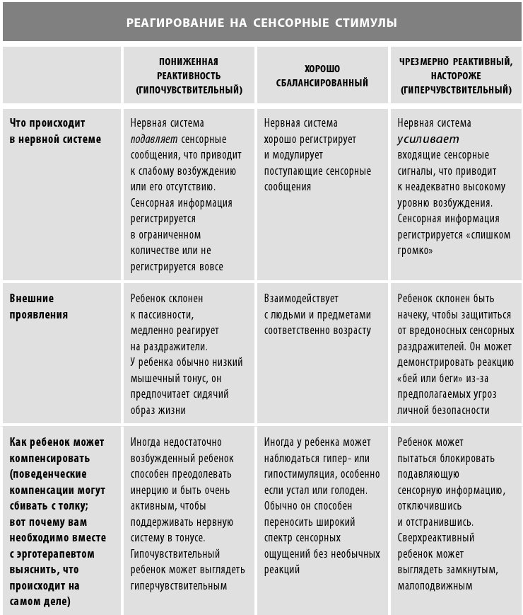 У многих детей эти признаки присутствуют по разным причинам. Некоторые из таких моделей поведения уместны в определенном возрасте. Большинство детей ясельного возраста довольно импульсивны – это потрясающие, но «ужасные» двухлетки. Но чрезмерно импульсивный четырехлетний ребенок – совсем другое дело. У разных детей может быть одинаково сильное отвращение к шерстяной одежде, дискомфорт при зрительном контакте с незнакомцами или страх перед козой, которая громко и неожиданно блеет в контактном зоопарке. Такие реакции попадают в диапазон так называемой типичной сенсорной чувствительности для ребенка до тех пор, пока не мешают повседневной деятельности. Ребенок с сенсорными проблемами обычно неадекватно реагирует на повседневные ситуации, постоянно демонстрируя поведение, не соответствующее возрасту. От таких реакций невозможно просто отмахнуться.