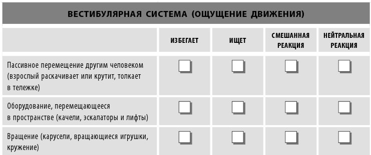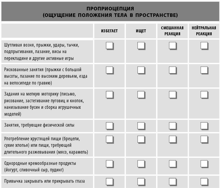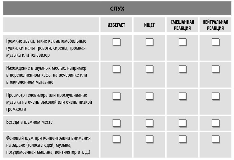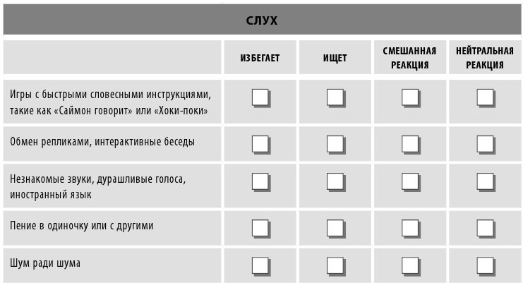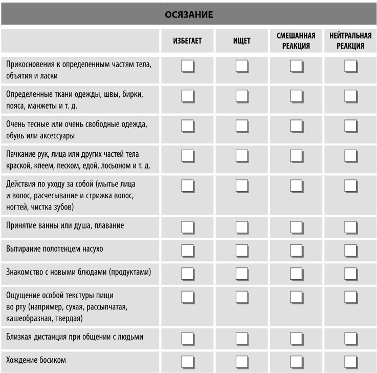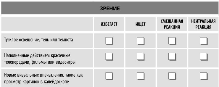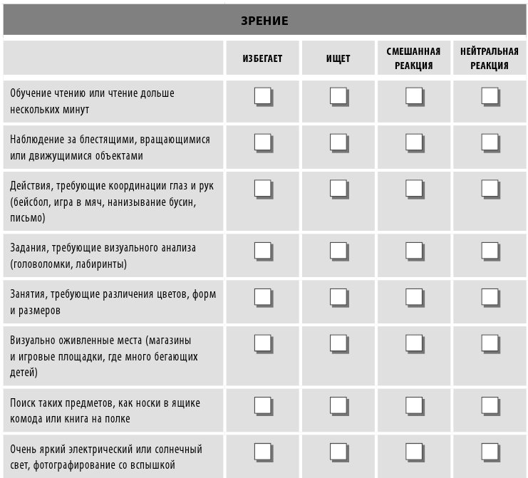 Если вы или учитель вашего ребенка поставили много «галочек» в столбцах «избегает», «ищет» или «смешанная реакция», обратитесь к эрготерапевту, который специально обучен диагностике и лечению расстройства сенсорной обработки. В главе 5 мы обсудим, как это сделать.