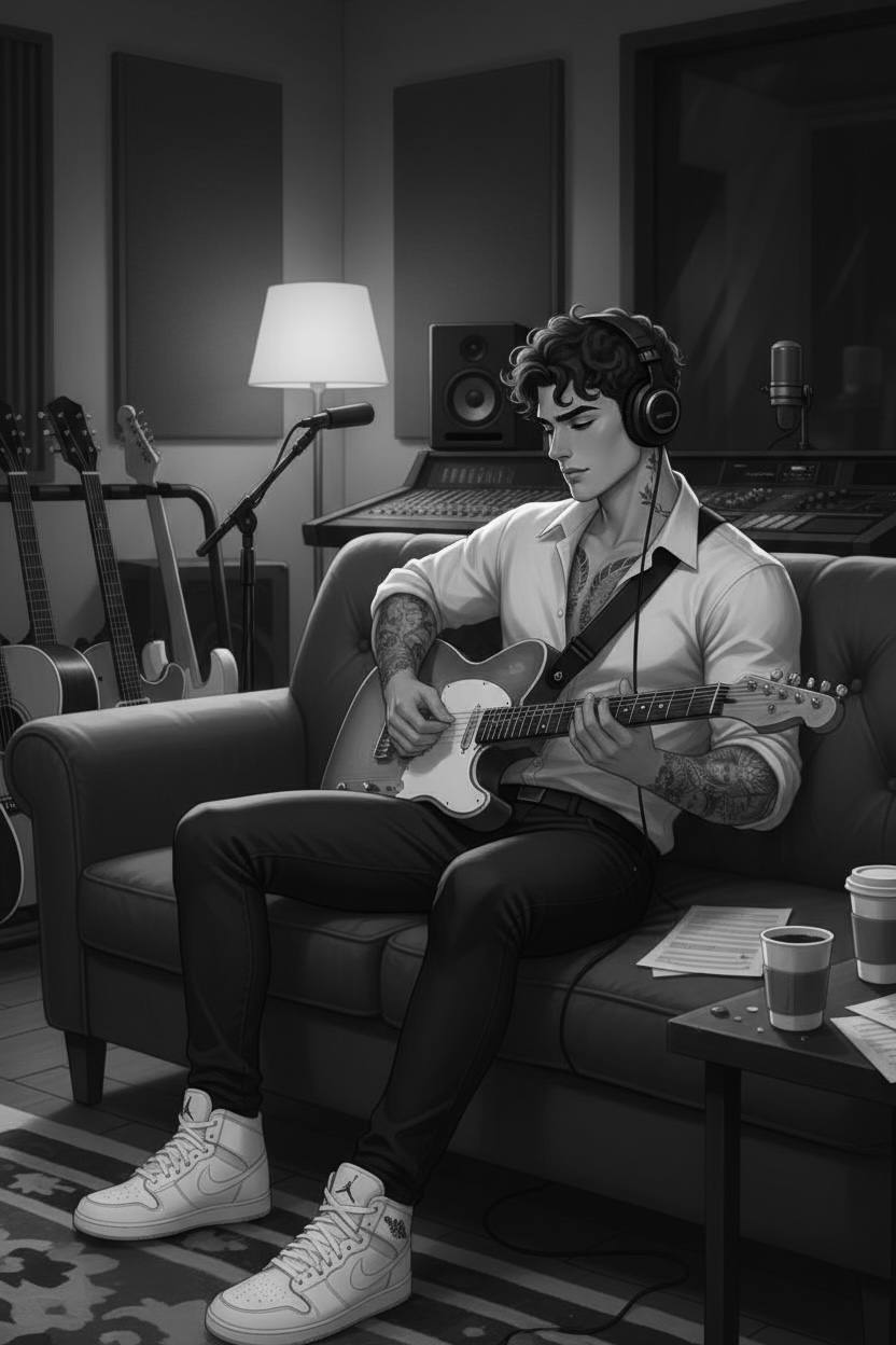 Сажусь на кожаный диван, знакомо проминающийся подо мной. Надеваю наушники на голову, приглушая внешний мир, и беру в руки гитару, заранее подключив ее к усилителю.