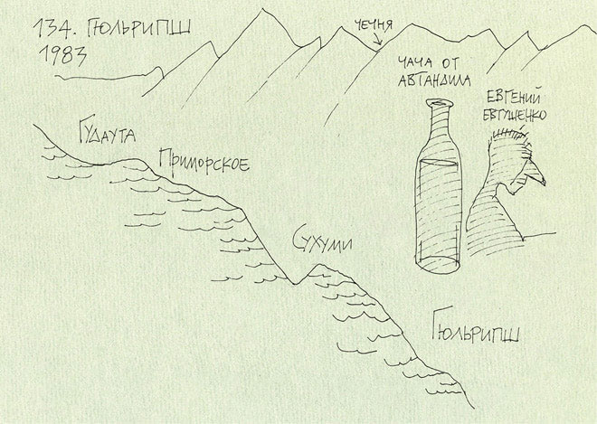 Мы – Маша Порудоминская, ее подружка (как же ее имя?), Коля Козлов, Витя Савинов, приехавший на следующий день, и я – поселились в доме, где Маша с родителями и сестрой отдыхала с детства. Дом стоял прямо у моря, до воды метров десять. Хозяйка была пожилая симпатичная армянка, ее муж – не то русский, не то украинец, бывший пограничник. Каждый вечер он напивался и мешал нам жить. Мы покойно сидели на берегу, выпивали и разговаривали, он появлялся и требовал, чтобы мы шли в дом, потому что мы шпионы и подаем сигналы туркам и американцам. Однажды полез в драку, но жена его утихомирила.