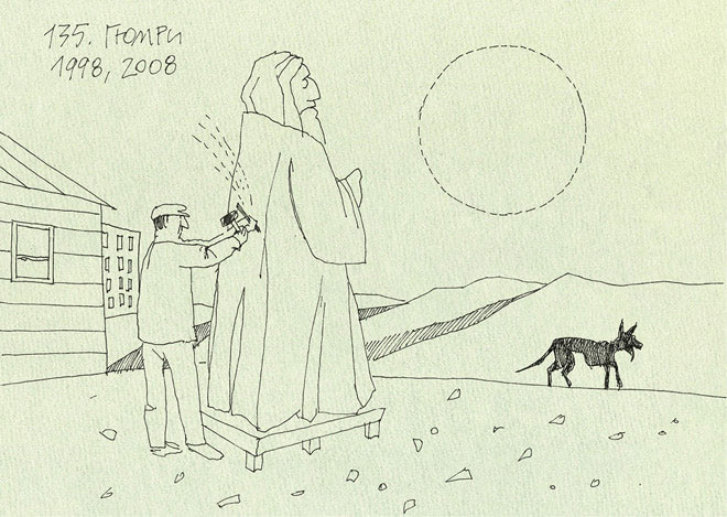 Но жить в «гостинице» на улице Тэтчер было невыносимо. Вода текла, лампочка светила, но Андрей впал в запой, да и возраст у меня уже не тот, чтобы спать в бараке. С утра на пустыре, где десять лет назад женщины веяли зерно, местный скульптор вырубал из блока белого известняка статую какого-то героя армянской истории, не то философа, не то поэта: бородатый, кудлатый четырехметровый истукан в монашеской рясе. Тюкать рубилом он начинал в семь утра, по прохладе. Когда я вставал с больной головой, он внимательно разглядывал свое творение, натруженной рукой гладил параллельные складки на рясе.