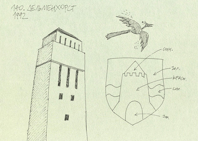 Наш хозяин – архитектор из Гандеркезее сказал, что обязательно надо поехать в городок Дельменхорст: там отличный ресторан с настоящей местной кухней. У въезда в Дельменхорст я увидел дорожный указатель с гербом города, на котором была изображена башня.