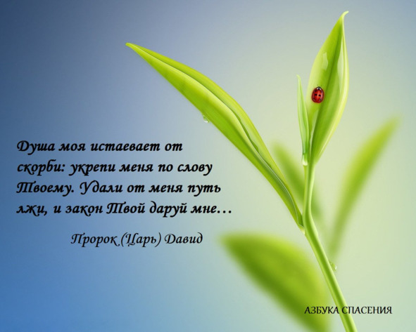 Душа моя повержена в прах, оживи меня по слову Твоему. Объявил я пути мои, и Ты услышал меня, научи меня уставам Твоим. Дай мне уразуметь путь повелений Твоих, и буду размышлять о чудесах Твоих. Душа моя истаевает от скорби: укрепи меня по слову Твоему. Удали от меня путь лжи, и закон Твой даруй мне. Я избрал путь истины, поставил пред собою суды Твои. Я прилепился к откровениям Твоим, Господи, не постыди меня. Потеку путем заповедей Твоих, когда Ты расширишь сердце мое (Пс.118:25—32).