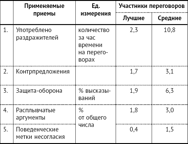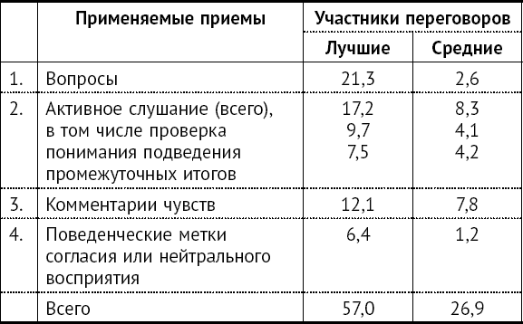 Данные в таблице свидетельствуют о том, что лучшие «переговорщики» тратят значительно меньше времени на приемы, работающие против них.