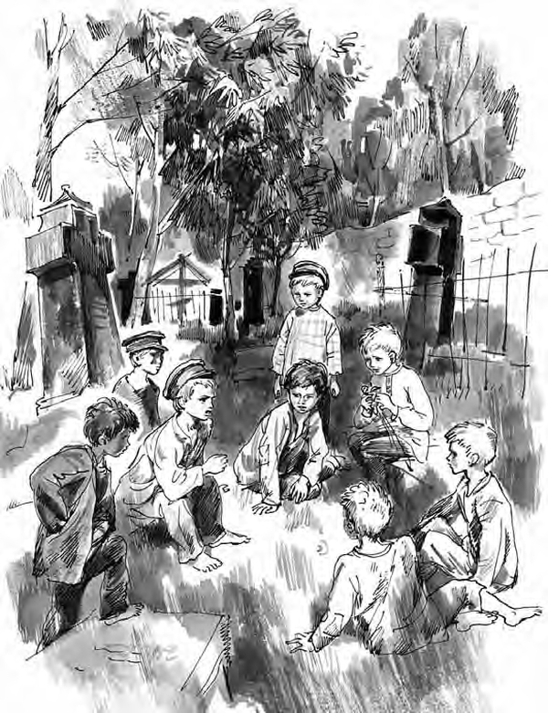 Вот дрожащими от волнения руками тянется кусочек серой нитки и пробуется ее крепость. Она годится для пускания змея, – ничего, что коротка, она будет связана с другими такими же нитками; ничего, что в ней запутались какие-то волосы и что-то прилипло, что она вся сбита в один запутанный комок, – тем больше наслаждения будет, когда, собравши свою добычу, ватага перелезет через кладбищенскую стену и, усевшись где-нибудь на старом памятнике, станет приводить в порядок свое богатство.