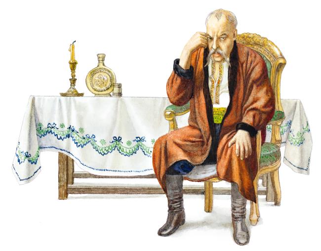 Сотник, уже престарелый, с седыми усами и с выражением мрачной грусти, сидел перед столом в светлице, подперши обеими руками голову. Ему было около пятидесяти лет; но глубокое уныние на лице и какой-то бледно-тощий цвет показывали, что душа его была убита и разрушена вдруг, в одну минуту, и вся прежняя веселость и шумная жизнь исчезли навеки. Когда взошел Хома вместе с старым козаком, он отнял одну руку и слегка кивнул головою на низкий их поклон.