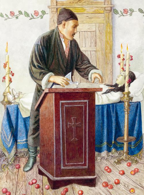 Когда солнце стало садиться, мертвую понесли в церковь. Философ одним плечом своим поддерживал черный траурный гроб и чувствовал на плече своем что-то холодное, как лед. Сотник сам шел впереди, неся рукою правую сторону тесного дома умершей. Церковь деревянная, почерневшая, убранная зеленым мохом, с тремя конусообразными куполами, уныло стояла почти на краю села. Заметно было, что в ней давно уже не отправлялось никакого служения. Свечи были зажжены почти перед каждым образом. Гроб поставили посередине, против самого алтаря. Старый сотник поцеловал еще раз умершую, повергнулся ниц и вышел вместе с носильщиками вон, дав повеление хорошенько накормить философа и после ужина проводить его в церковь. Пришедши в кухню, все несшие гроб начали прикладывать руки к печке, что обыкновенно делают малороссияне, увидевши мертвеца.