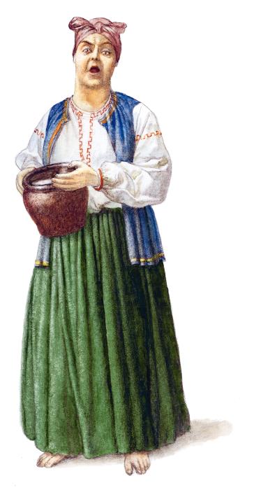 Философ уселся вместе с другими в обширный кружок на вольном воздухе перед порогом кухни. Скоро баба в красном очипке высунулась из дверей, держа в обеих руках горячий горшок с галушками, и поставила его посреди готовившихся ужинать. Каждый вынул из кармана своего деревянную ложку, иные, за неимением, деревянную спичку. Как только уста стали двигаться немного медленнее и волчий голод всего этого собрания немного утишился, многие начали разговаривать. Разговор, натурально, должен был обратиться к умершей.